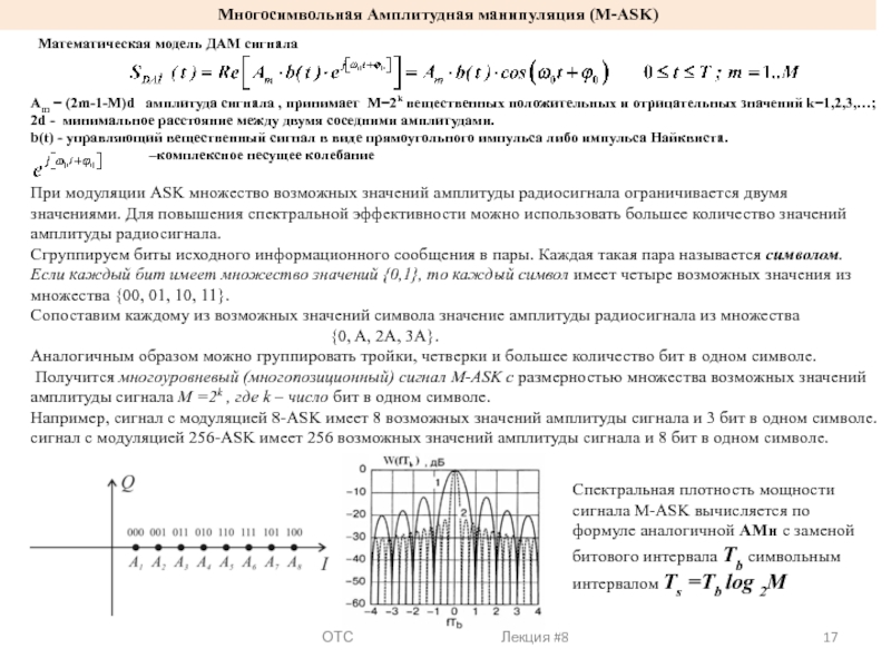 Спектральная плотность мощности сигнала M-ASK вычисляется по формуле аналогичной АМн с заменой битового интервала Tb символьным интервалом Ts =Tb log 2M