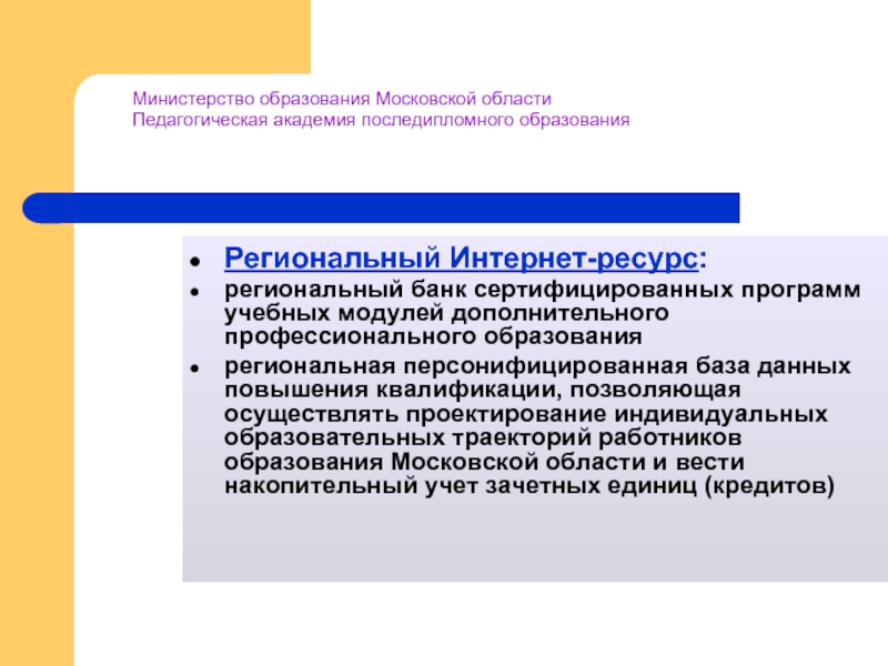 региональная персонифицированная база данных повышения квалификации, позволяющая осуществлять проектирование индивидуальных образовательных траекторий работников образования Московской области и вести накопительный учет зачетных единиц (кредитов)