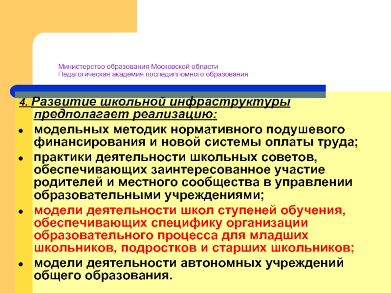 школами самостоятельности как в составлении индивидуальных образовательных программ, так и в расходовании финансовых средств. Развитие концессионных механизмов для привлечения к управлению школами частных инвесторов.