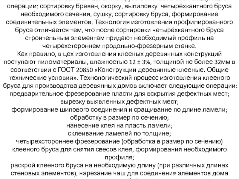 Слайд 16Технология изготовления цельного бруса включает в себя следующие операции: сортировку бревен,