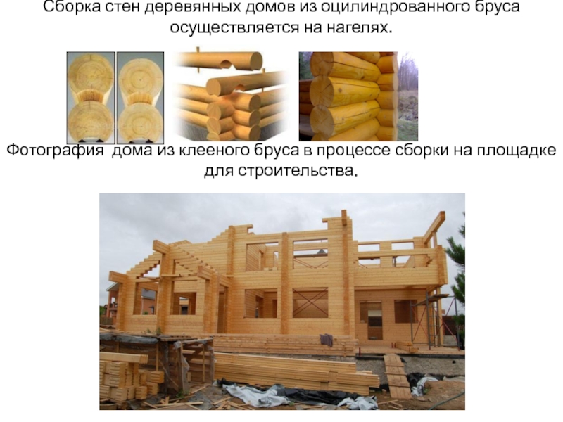 Слайд 18Сборка стен деревянных домов из оцилиндрованного бруса осуществляется на нагелях.