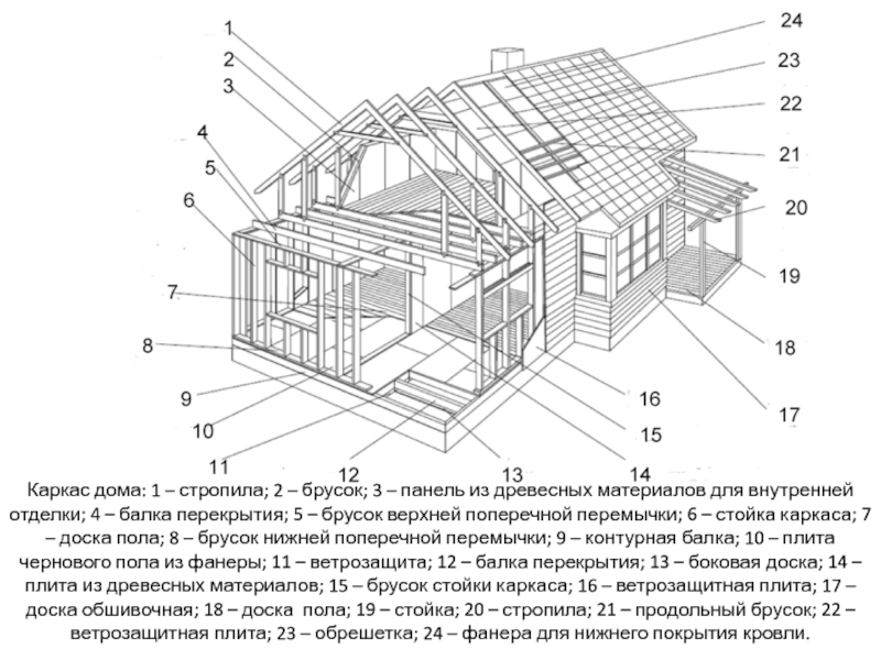 из древесных материалов для внутренней отделки; 4 – балка перекрытия; 5 – брусок верхней поперечной перемычки; 6 – стойка каркаса; 7 – доска пола; 8 – брусок нижней поперечной перемычки; 9 – контурная балка; 10 – плита чернового пола из фанеры; 11 – ветрозащита; 12 – балка перекрытия; 13 – боковая доска; 14 – плита из древесных материалов; 15 – брусок стойки каркаса; 16 – ветрозащитная плита; 17 – доска обшивочная; 18 – доска пола; 19 – стойка; 20 – стропила; 21 – продольный брусок; 22 – ветрозащитная плита; 23 – обрешетка; 24 – фанера для нижнего покрытия кровли.