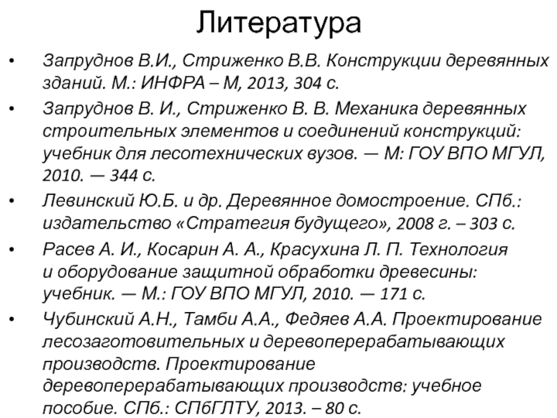 Запруднов В.И., Стриженко В.В. Конструкции деревянных зданий. М.: ИНФРА – М,