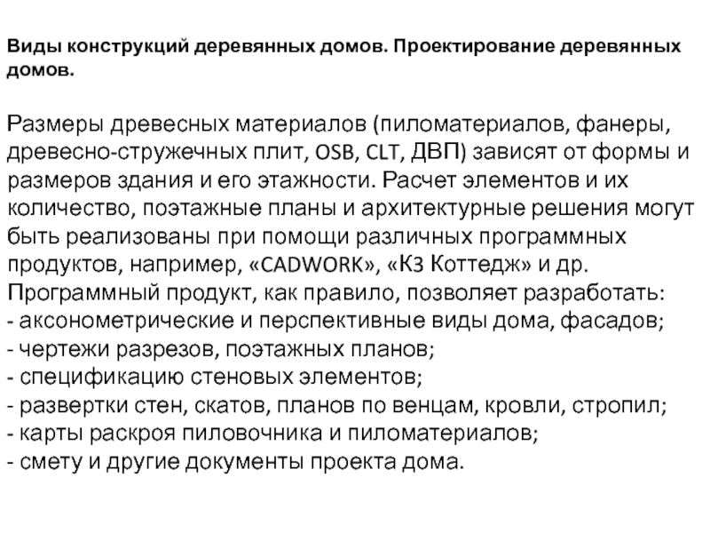 древесно-стружечных плит, OSB, CLT, ДВП) зависят от формы и размеров здания и его этажности. Расчет элементов и их количество, поэтажные планы и архитектурные решения могут быть реализованы при помощи различных программных продуктов, например, «CADWORK», «К3 Коттедж» и др. Программный продукт, как правило, позволяет разработать: