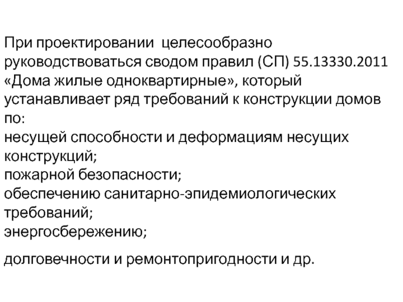 Слайд 14При проектировании целесообразно руководствоваться сводом правил (СП) 55.13330.2011 «Дома жилые одноквартирные»,