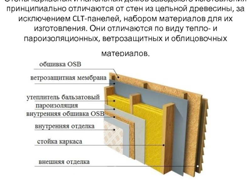 Слайд 13Стены каркасных и панельных домов заводского изготовления принципиально отличаются от стен