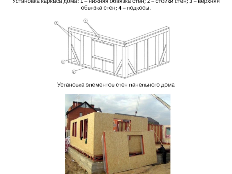 Слайд 21Установка каркаса дома: 1 – нижняя обвязка стен; 2 – стойки