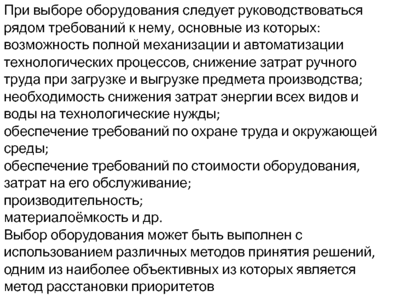 Слайд 17При выборе оборудования следует руководствоваться рядом требований к нему, основные из