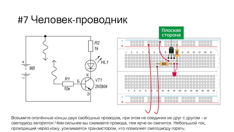 их друг с другом – и светодиод загорится! Чем сильнее вы сжимаете провода, тем ярче он светится. Небольшой ток, проходящий через кожу, усиливается транзистором, что позволяет светодиоду гореть