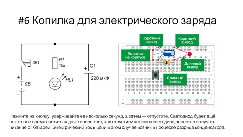 а затем — отпустите. Светодиод будет ещё некоторое время светиться даже после того, как отпустили кнопку и светодиод перестал получать питание от батареи. Электрический ток в цепи в этом случае возник в процессе разряда конденсатора.