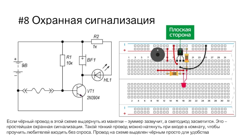 макетки – зуммер зазвучит, а светодиод засветится. Это – простейшая охранная сигнализация. Такой тонкий провод можно натянуть при входе в комнату, чтобы проучить любителей входить без спроса. Провод на схеме выделен чёрным просто для удобства