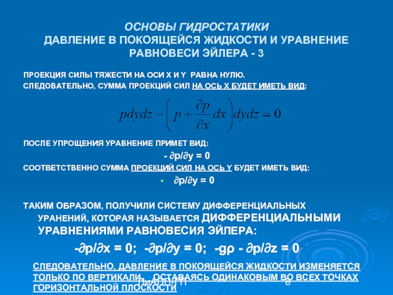 ДАВЛЕНИЕ В ПОКОЯЩЕЙСЯ ЖИДКОСТИ И УРАВНЕНИЕ РАВНОВЕСИ ЭЙЛЕРА - 3