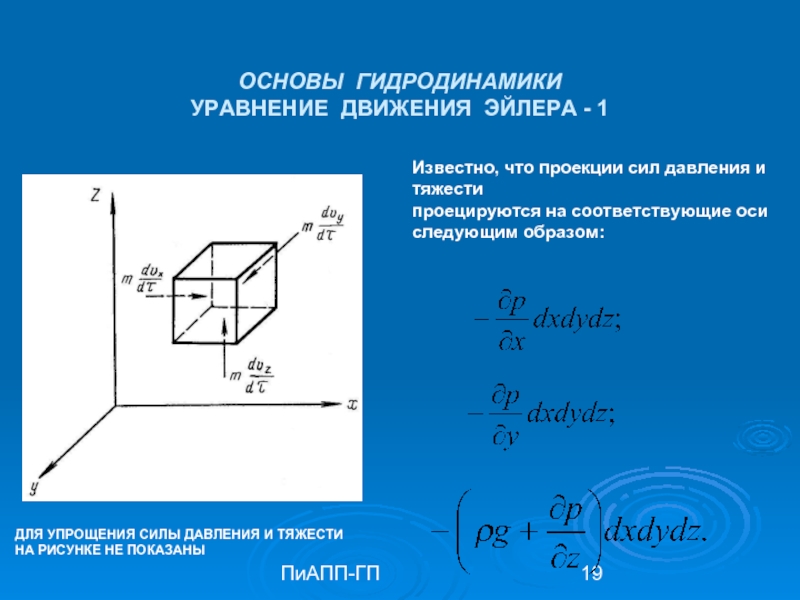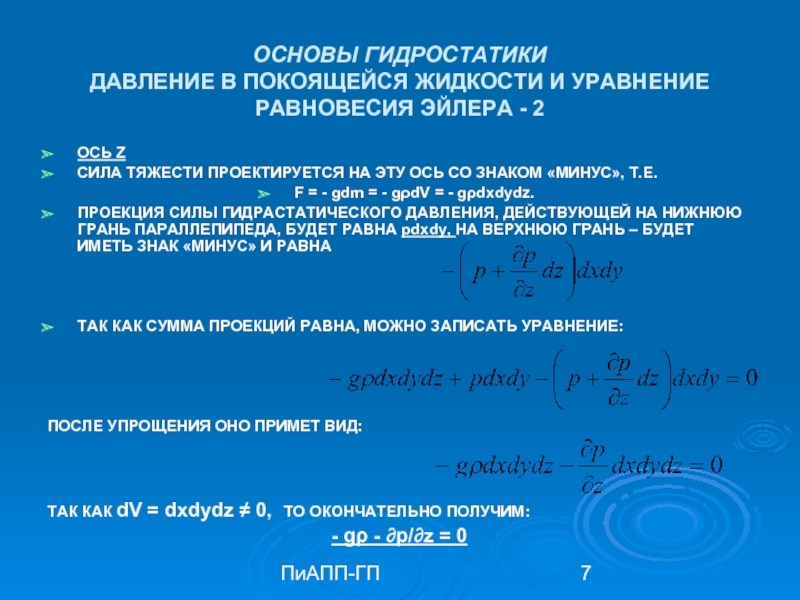 ПРОЕКЦИЯ СИЛЫ ГИДРАСТАТИЧЕСКОГО ДАВЛЕНИЯ, ДЕЙСТВУЮЩЕЙ НА НИЖНЮЮ ГРАНЬ ПАРАЛЛЕПИПЕДА, БУДЕТ РАВНА рdxdy, НА ВЕРХНЮЮ ГРАНЬ – БУДЕТ ИМЕТЬ ЗНАК «МИНУС» И РАВНА