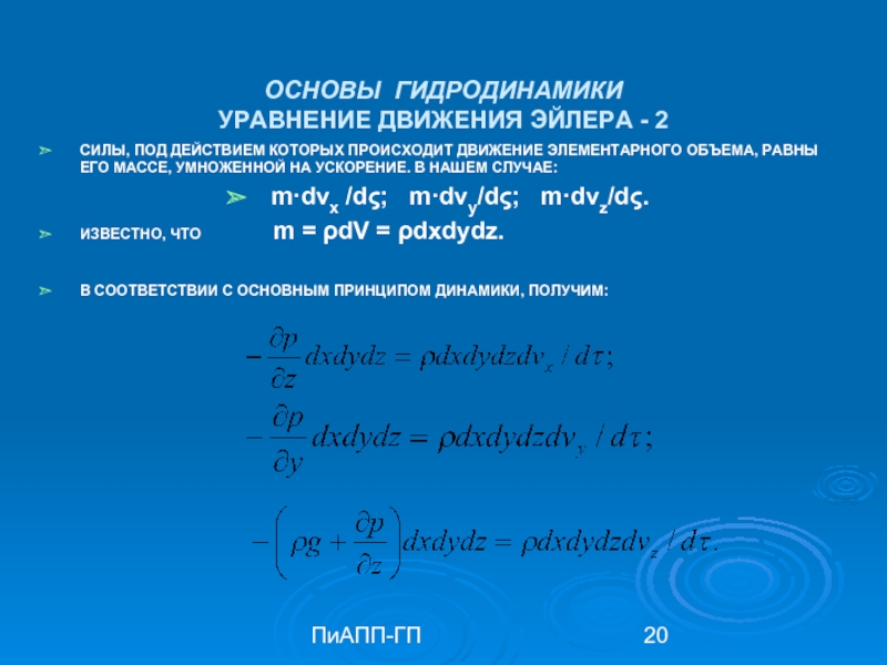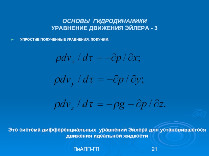 ∂р/∂y РАВНЫ НУЛЮ, ЧАСТНУЮ ПРОИЗВОДНУЮ ∂р/∂z МОЖНО ЗАМЕНИТЬ НА dp/dz, ТОГДА ПОСЛЕДНЕЕ УРАВНЕНИЕ В СИСТЕМЕ УРАВНЕНИЙ ЭЙЛЕРА ПРИМЕТ ВИД: