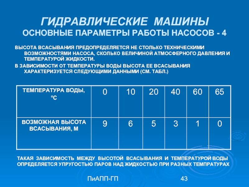 В ЗАВИСИМОСТИ ОТ ТЕМПЕРАТУРЫ ВОДЫ ВЫСОТА ЕЕ ВСАСЫВАНИЯ ХАРАКТЕРИЗУЕТСЯ СЛЕДУЮЩИМИ ДАННЫМИ (СМ. ТАБЛ.)