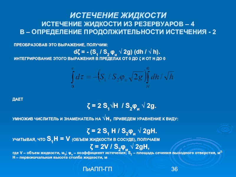 dV = S2φи √ 2gh · dζ = - S1dh.