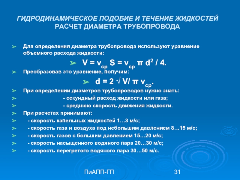 ρ – плотность жидкости, кг/м3; V – расход жидкости, м3/с; v – скорость жидкости, м/с.