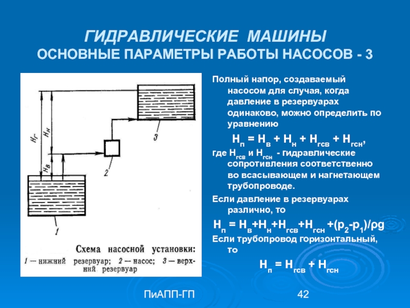 Полный напор в случае, когда давление жидкости в нижнем и верхнем резервуарах одинаково, представляет собой сумму высот всасывания и нагнетания, сумму гидравлических сопротивлений во всасывающем и нагнетательном трубопроводах.
