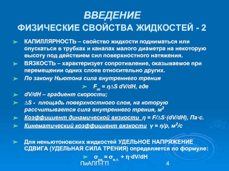 ВЯЗКОСТЬ – характеризует сопротивление, оказываемое при перемещении одних слоев относительно других.