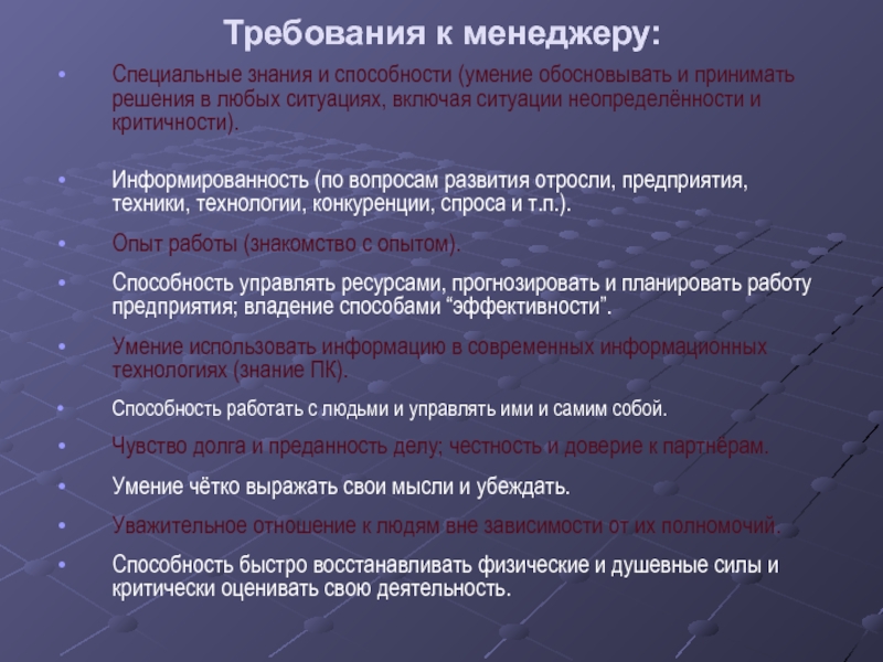 Способность управлять ресурсами, прогнозировать и планировать работу предприятия; владение способами “эффективности”.