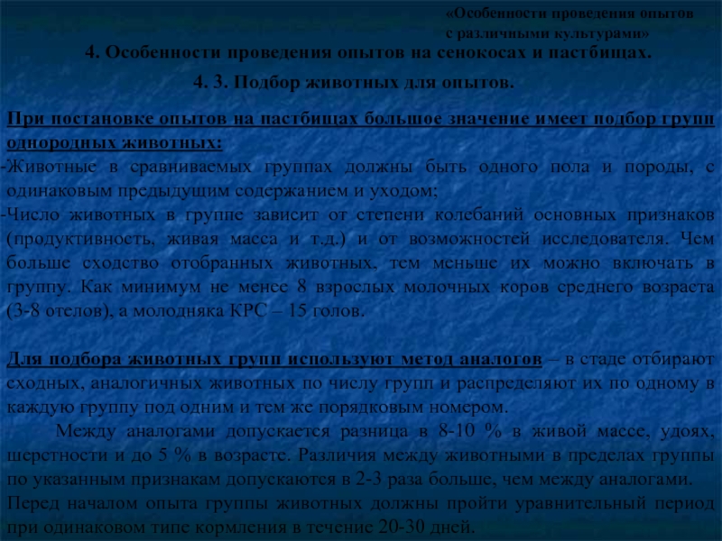 При постановке опытов на пастбищах большое значение имеет подбор групп однородных животных:
