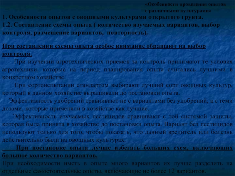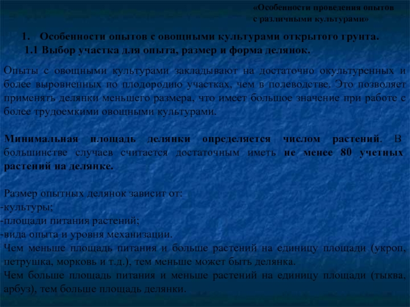 Особенностями методики при закладке опытов с овощными культурами открытого грунта являются:
