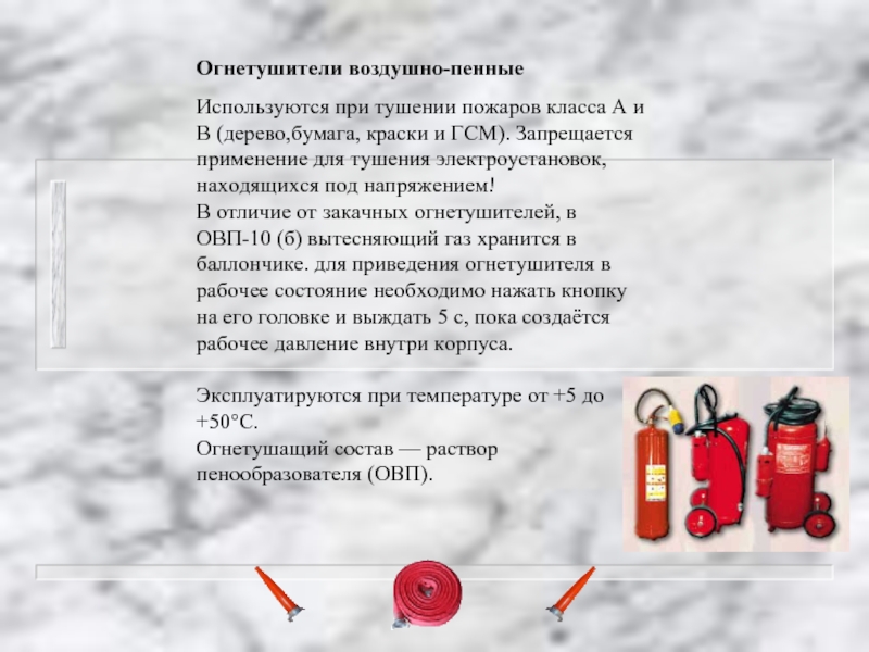 и ГСМ). Запрещается применение для тушения электроустановок, находящихся под напряжением!