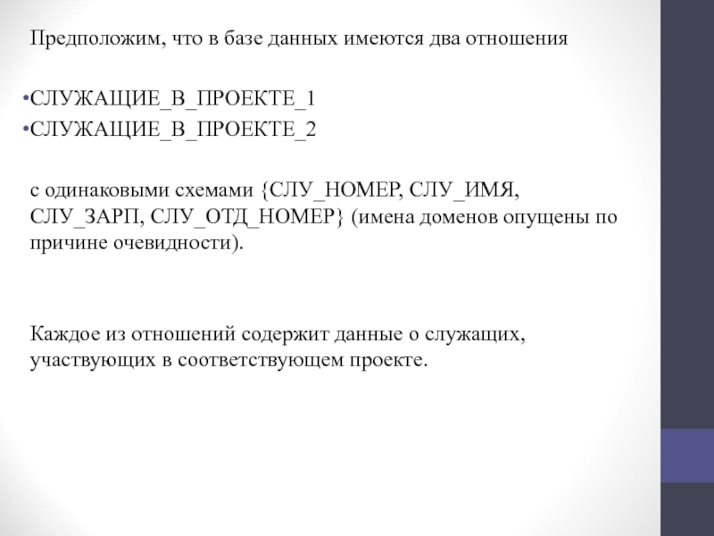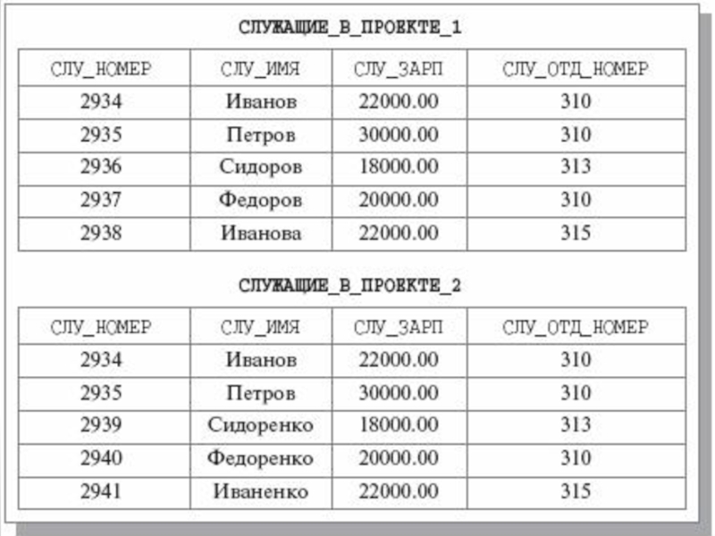 одинаковыми схемами {СЛУ_НОМЕР, СЛУ_ИМЯ, СЛУ_ЗАРП, СЛУ_ОТД_НОМЕР} (имена доменов опущены по причине очевидности).