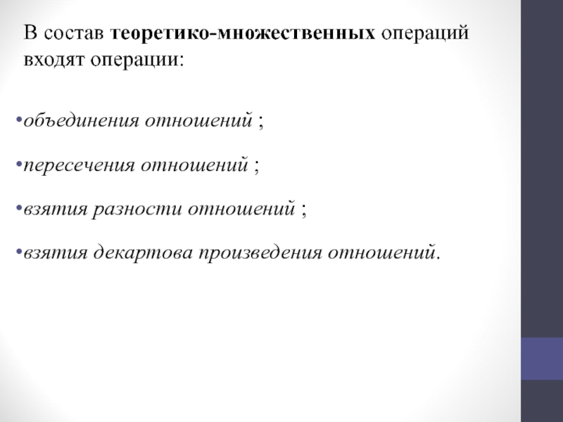 Слайд 4В состав теоретико-множественных операций входят операции: