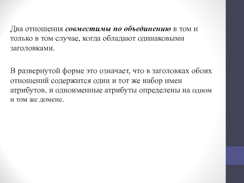 Слайд 11Два отношения совместимы по объединению в том и только в том