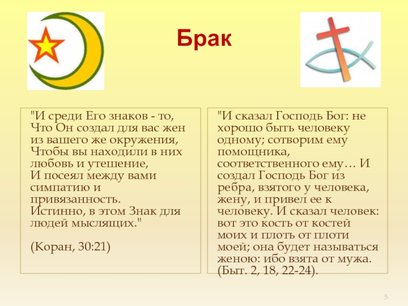 "И сказал Господь Бог: не хорошо быть человеку одному; сотворим ему помощника, соответственного ему… И создал Господь Бог из ребра, взятого у человека, жену, и привел ее к человеку. И сказал человек: вот это кость от костей моих и плоть от плоти моей; она будет называться женою: ибо взята от мужа. (Быт. 2, 18, 22-24).
