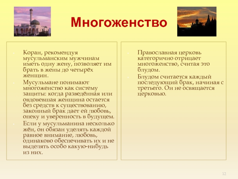 Православная церковь категорично отрицает многоженство, считая это блудом.