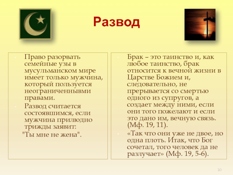 «А вступившим в брак не я повелеваю, а Господь: жене не разводиться с мужем, – если же разведется, то должна оставаться безбрачною, или примириться с мужем своим, – и мужу не оставлять жены своей (Апостол Павел, 1 Кор 7, 10-11).