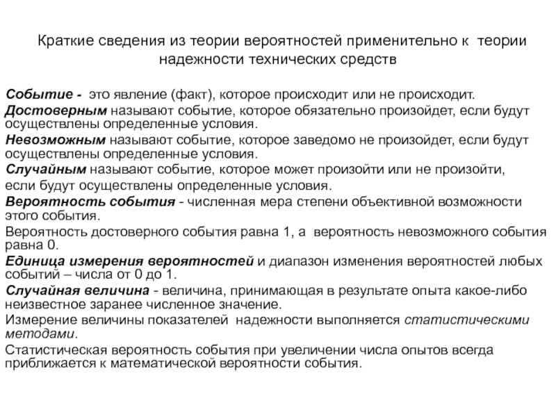 Слайд 8Краткие сведения из теории вероятностей применительно к теории надежности технических средств