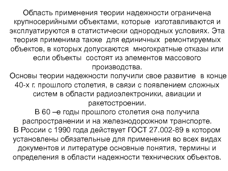 Слайд 6Область применения теории надежности ограничена крупносерийными объектами, которые изготавливаются и эксплуатируются