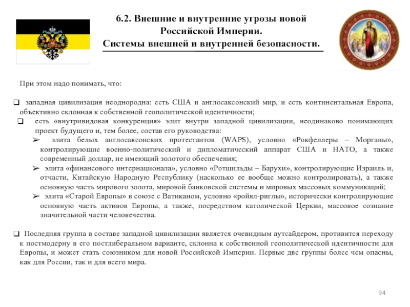 В момент создания новой Российской Империи мы объективно разрушим их планы по созданию Нового Мирового Порядка, и основные проблемы безопасности Российской Империи следует ждать именно от США и его сателлитов. Очевидно, что нормализация внешнеполитических и иных отношений с этой группой стран может быть непростой и занять длительное время.