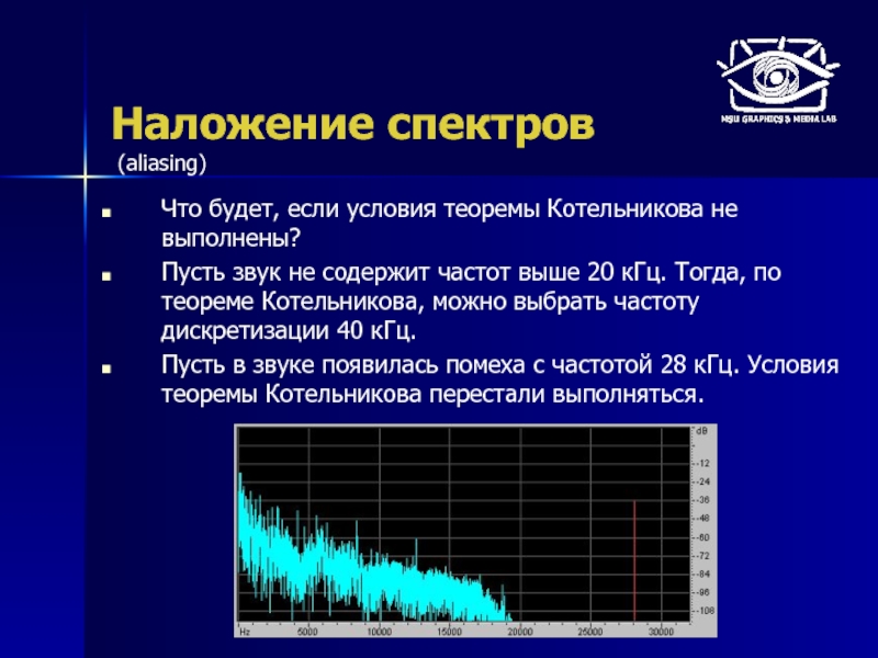 Пусть в звуке появилась помеха с частотой 28 кГц. Условия теоремы Котельникова перестали выполняться.