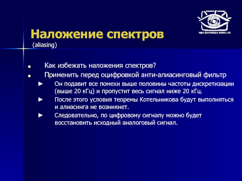 После этого условия теоремы Котельникова будут выполняться и алиасинга не возникнет.