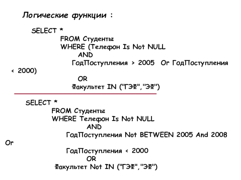 ГодПоступления Not BETWEEN 2005 And 2008 Or
