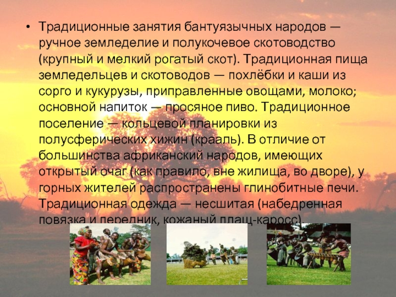 Слайд 14Традиционные занятия бантуязычных народов — ручное земледелие и полукочевое скотоводство (крупный