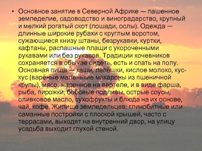 Слайд 7Основное занятие в Северной Африке — пашенное земледелие, садоводство и виноградарство,