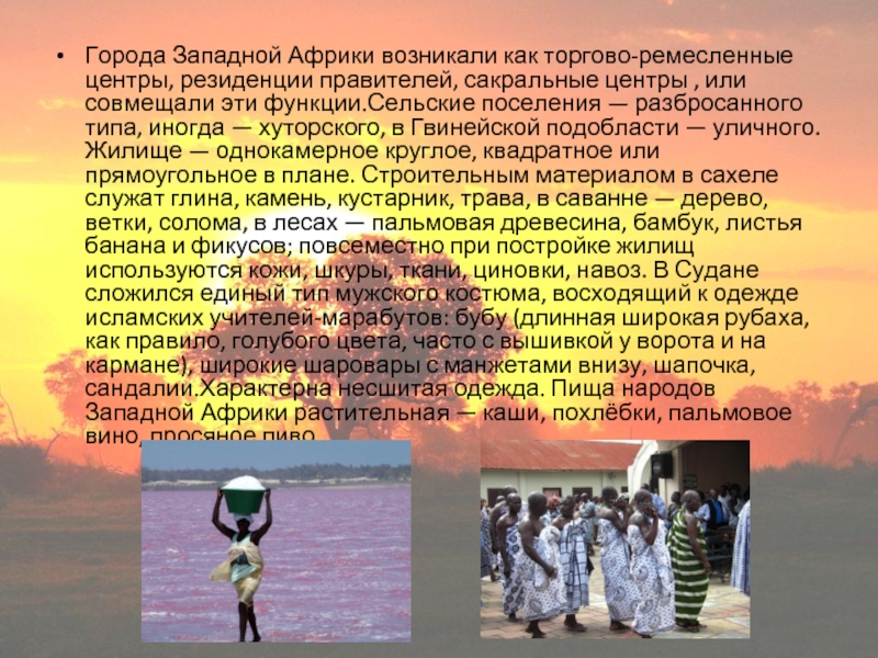 , или совмещали эти функции.Сельские поселения — разбросанного типа, иногда — хуторского, в Гвинейской подобласти — уличного. Жилище — однокамерное круглое, квадратное или прямоугольное в плане. Строительным материалом в сахеле служат глина, камень, кустарник, трава, в саванне — дерево, ветки, солома, в лесах — пальмовая древесина, бамбук, листья банана и фикусов; повсеместно при постройке жилищ используются кожи, шкуры, ткани, циновки, навоз. В Судане сложился единый тип мужского костюма, восходящий к одежде исламских учителей-марабутов: бубу (длинная широкая рубаха, как правило, голубого цвета, часто с вышивкой у ворота и на кармане), широкие шаровары с манжетами внизу, шапочка, сандалии.Характерна несшитая одежда. Пища народов Западной Африки растительная — каши, похлёбки, пальмовое вино, просяное пиво.