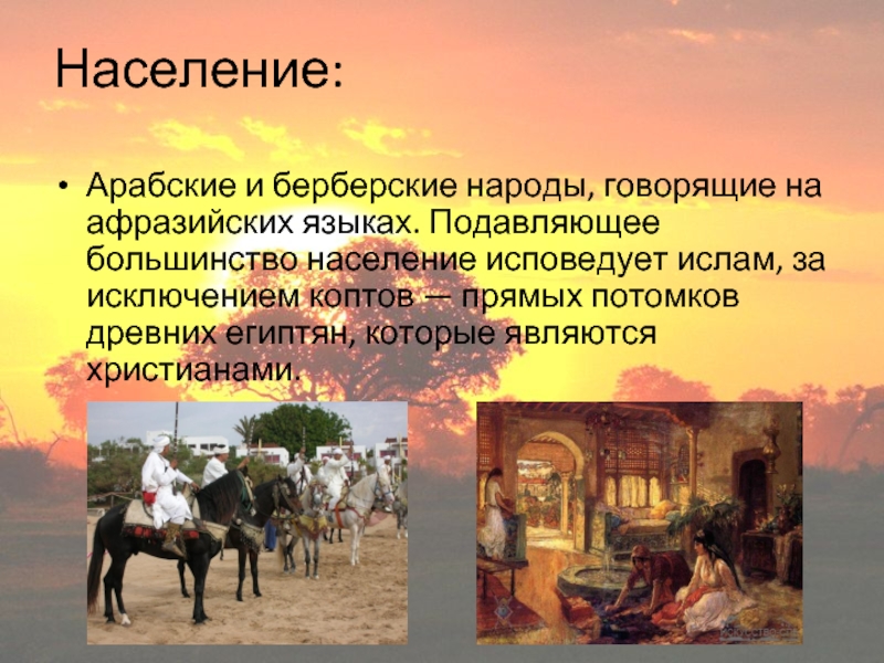 Арабские и берберские народы, говорящие на афразийских языках. Подавляющее большинство население
