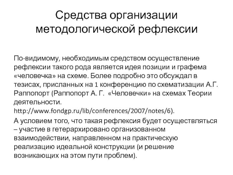 идея позиции и графема «человечка» на схеме. Более подробно это обсуждал в тезисах, присланных на 1 конференцию по схематизации А.Г.Раппопорт (Раппопорт А. Г. «Человечки» на схемах Теории деятельности. http://www.fondgp.ru/lib/conferences/2007/notes/6).