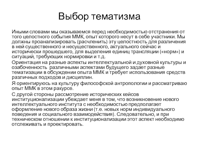 события ММК, опыт которого несут в себе участники. Мы должны проанализировать (расчленить) эту целостность для различения в ней существенного и несущественного, актуального сейчас и исторически прошедшего, для выделения единиц трансляции («норм») и ситуаций, требующих нормировки и т.д.