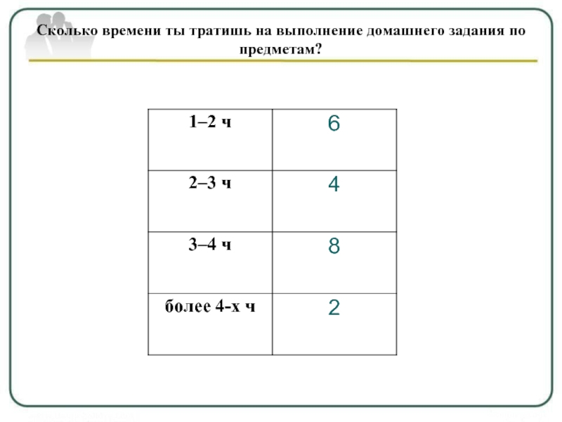 Слайд 20Сколько времени ты тратишь на выполнение домашнего задания по предметам?
