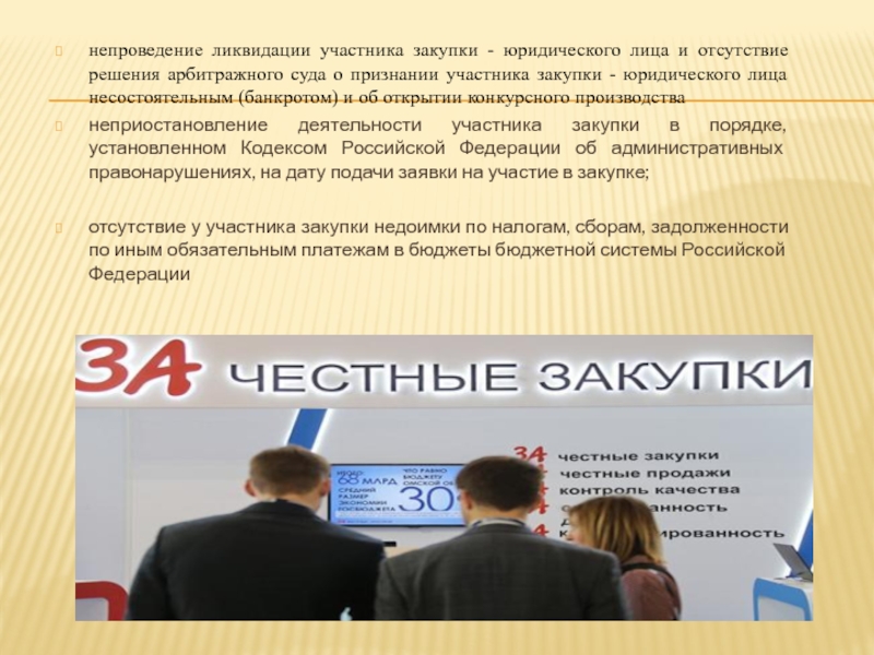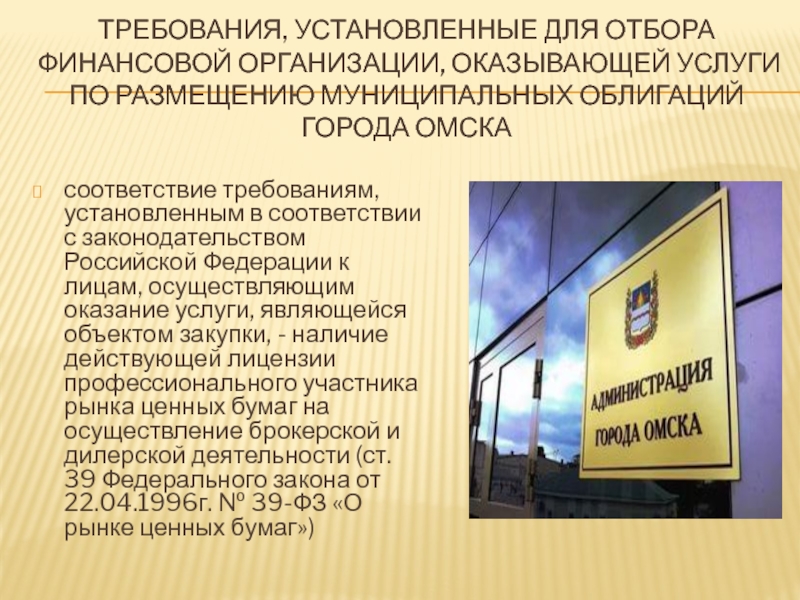 соответствие требованиям, установленным в соответствии с законодательством Российской Федерации к лицам, осуществляющим оказание услуги, являющейся объектом закупки, - наличие действующей лицензии профессионального участника рынка ценных бумаг на осуществление брокерской и дилерской деятельности (ст. 39 Федерального закона от 22.04.1996г. № 39-ФЗ «О рынке ценных бумаг»)