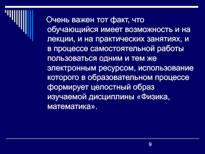 Слайд 9 Очень важен тот факт, что обучающийся имеет возможность и