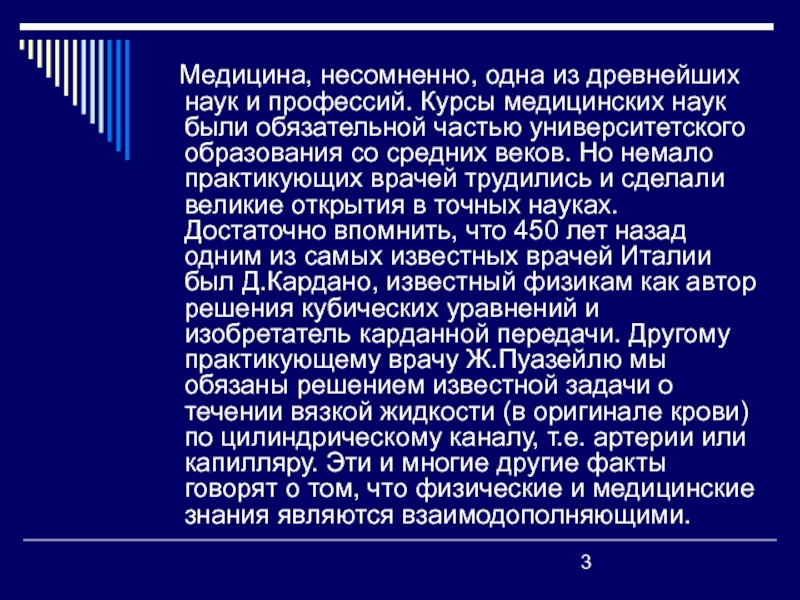 медицинских наук были обязательной частью университетского образования со средних веков. Но немало практикующих врачей трудились и сделали великие открытия в точных науках. Достаточно впомнить, что 450 лет назад одним из самых известных врачей Италии был Д.Кардано, известный физикам как автор решения кубических уравнений и изобретатель карданной передачи. Другому практикующему врачу Ж.Пуазейлю мы обязаны решением известной задачи о течении вязкой жидкости (в оригинале крови) по цилиндрическому каналу, т.е. артерии или капилляру. Эти и многие другие факты говорят о том, что физические и медицинские знания являются взаимодополняющими.