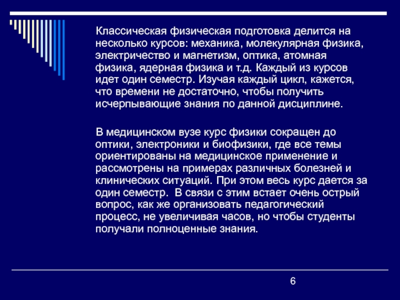 Слайд 6 Классическая физическая подготовка делится на несколько курсов: механика,